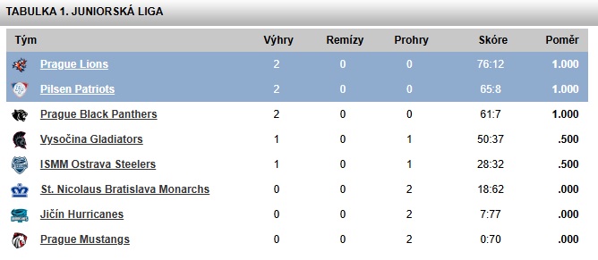 V sobotu od 15 hodin přivítá náš juniorský tým v souboji neporažených Prague Black Panthers. Vzhledem k tomu, že v juniorské lize není play off a jen první dva týmy se podívají do finále jde o zápas, který hodně napoví o tom, jestli na finále může myslet i náš tým. Oba týmy mají za sebou vítězství na půdě Prague Mustangs (Patriots 54:0, PBP 60:0). PBP v druhém kole přehrálo ISSM Ostravu Steelers. 26:7, Patriots Vysočinu Gladiators 30:8. V současné tabulce jsou Patriots tedy o mírný kousek před PBP. I díky pravidlu, které jakékoliv vítězství nad 35 bodu zapisuje do tabulky jen právě tento rozdíl.