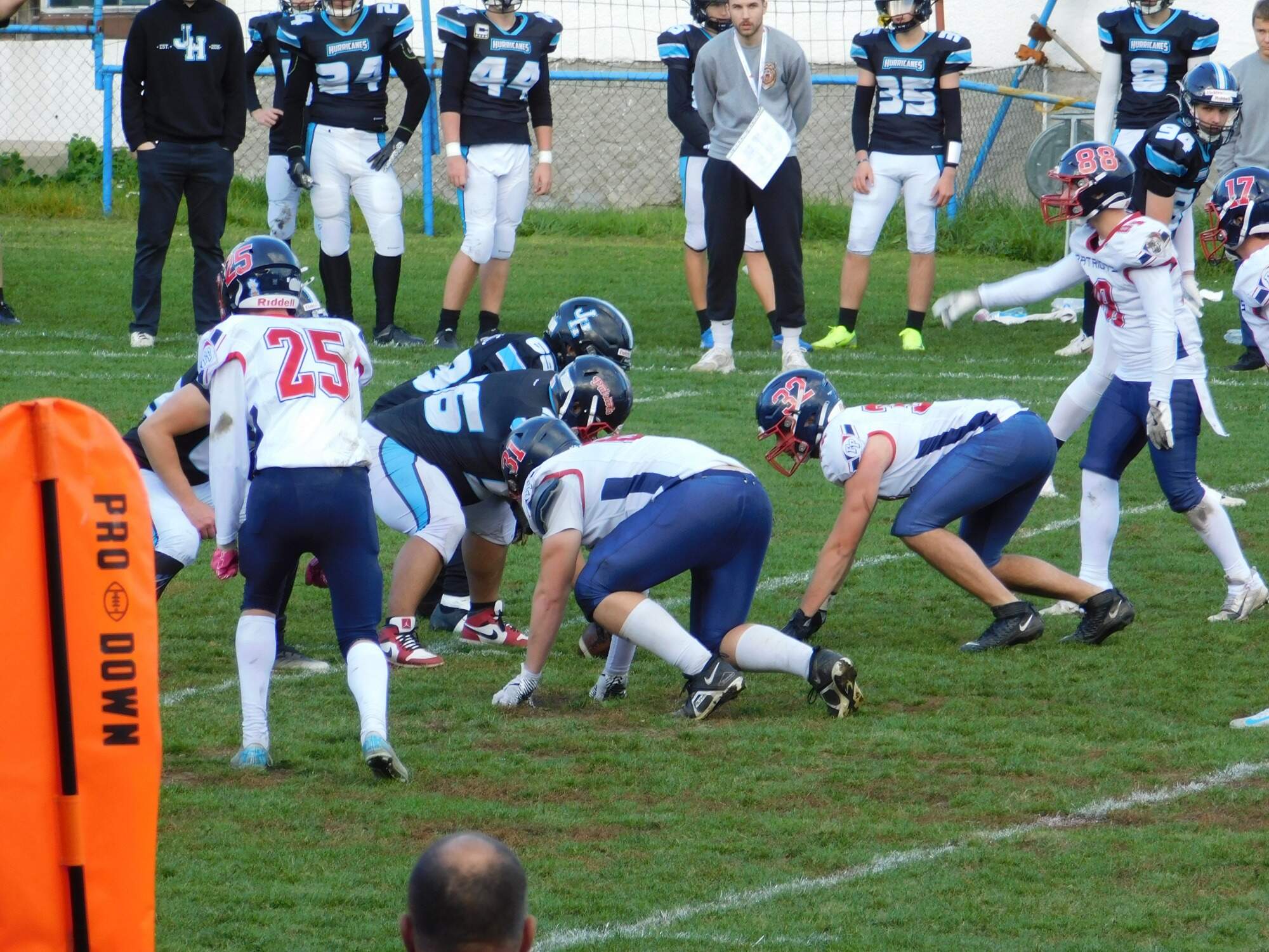 Po na body bohaté první čtvrtině převzaly v zápase iniciativu do té doby neúspěšné obrany obou mužstev. Na další body jsme čekali až do poloviny třetí čtvrtiny. To Jonáš Beneš našel 9y pasem v endzoně Matěje Urbana. Potvrdit se opět nepodařilo - 26:12. V závěrečné čtvrtině už nad obranou opět dominoval útok. Na runový touchdown domácího quarterbecka Jonáše Beneše reagoval hostující receiver Radim Bittner zachycením pasu od náhradního quarterbecka hostů Vojtěcha Šantrocha. Poslední slovo měli všek opět domácí, Matěj Urban zachytil další pas Jonáše Beneše a úspěšným kickem uzavřel skore na konečných 40:18.