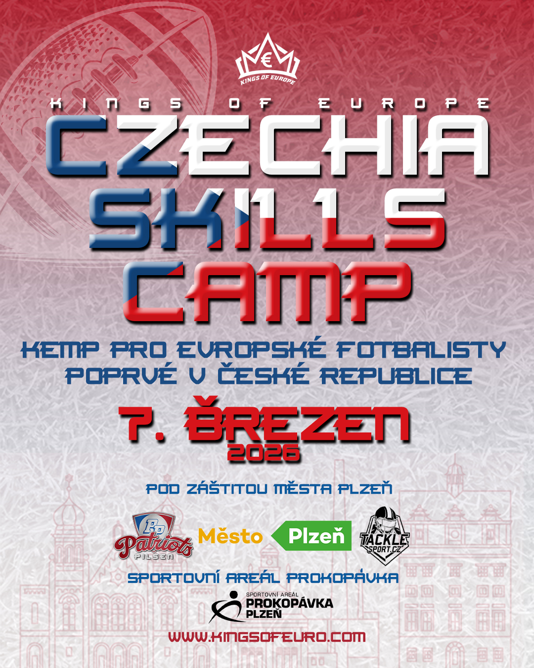 Víkend 7.-8.3.2026 bude patřit americkému fotbalu. V Plzni totiž za podpory města Plzeň proběhne camp Kings of Europe. Ten dává šanci všem hráčům amerického fotbalu vyzkoušet své dovednosti, absolvovat tradiční combine test a druhý den se v případě zájmu zúčastnit flagového turnaje. Tento pořadatel má za sebou pestrou historii, podobné akce už proběhli například v Paříži, Londýně, Basileji nebo ve Frankfurtu. Máme tak velkou radost, že taková akce zavítá i k nám.
