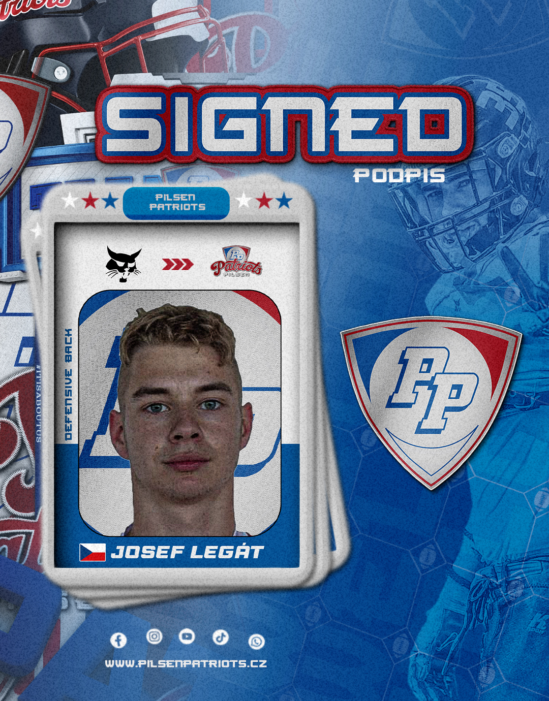 Ahoj, jmenuju se Josef Legát. Moje přezdívka je Joža. Hraji na postu defenzivního backa. Před příchodem do Patriots jsem působil v Příbram Bobcats.