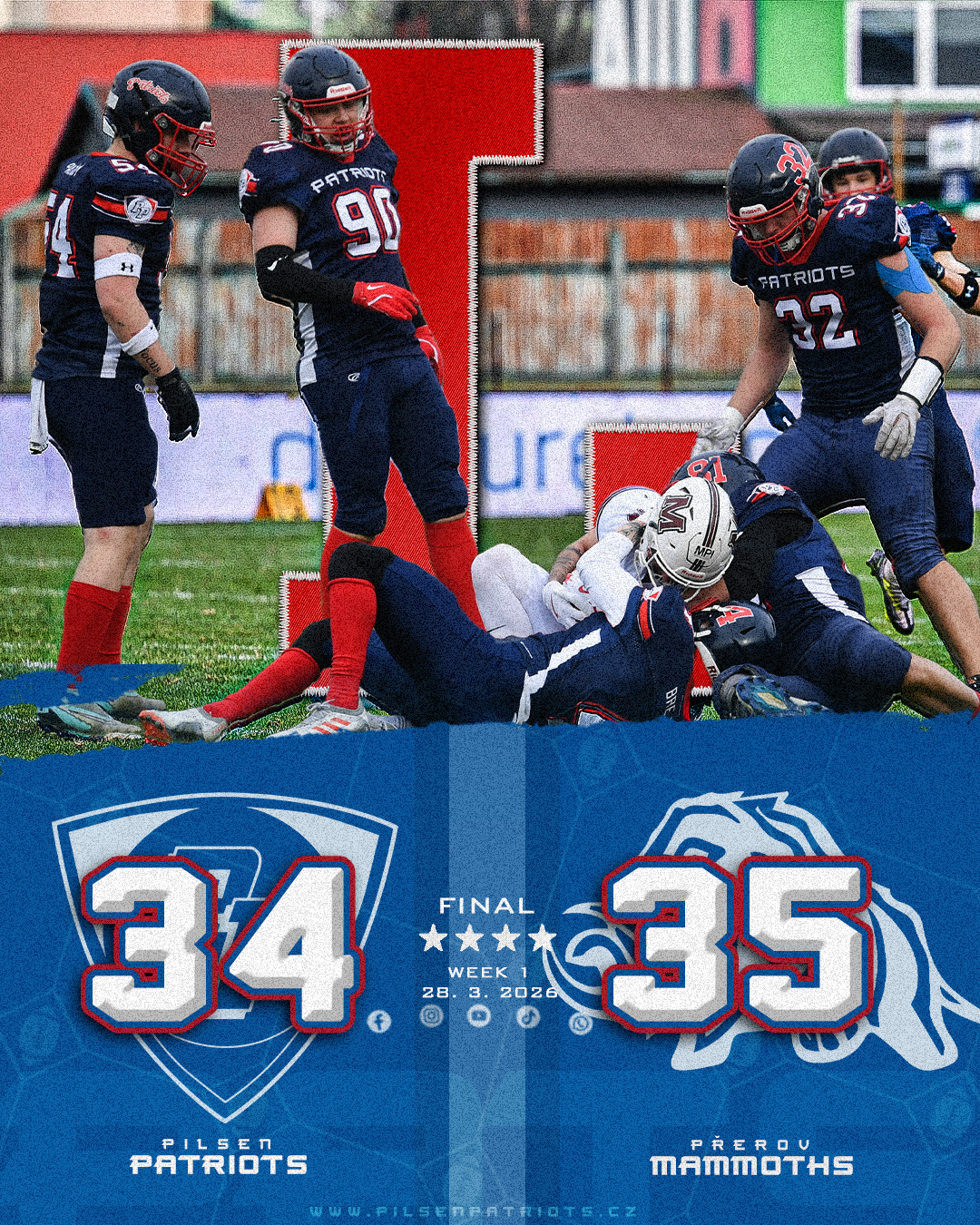 Viděli jsme velmi zajímavé utkání, spoustu bodů, napínavé až do samotného závěru. Domácí obrana dlouho hledala recept zejména na hostující běhovou hru. Hostům patří gratulace k výhře, domácí comeback do zápasu však také zaslouží uznání. Zápas ukázal, že by ani jeden tým neměl být v letošní sezoně do počtu. Patriots musí hodit porážku za hlavu, protože už v neděli je čeká další zápas, tentokrát na půdě Znojmo Knights.
